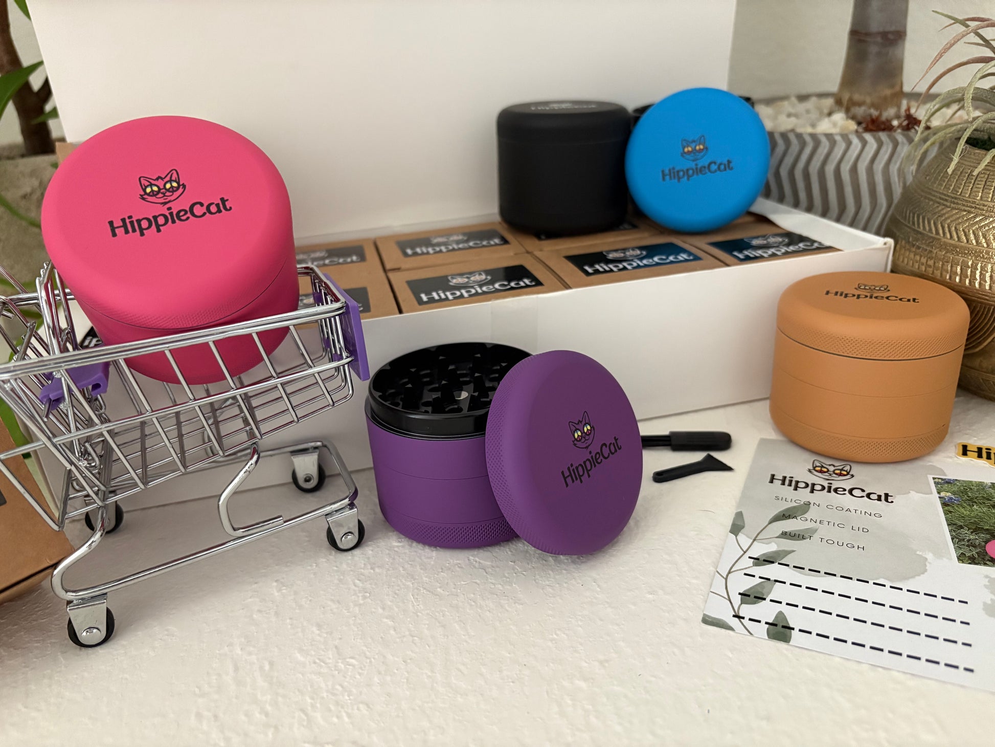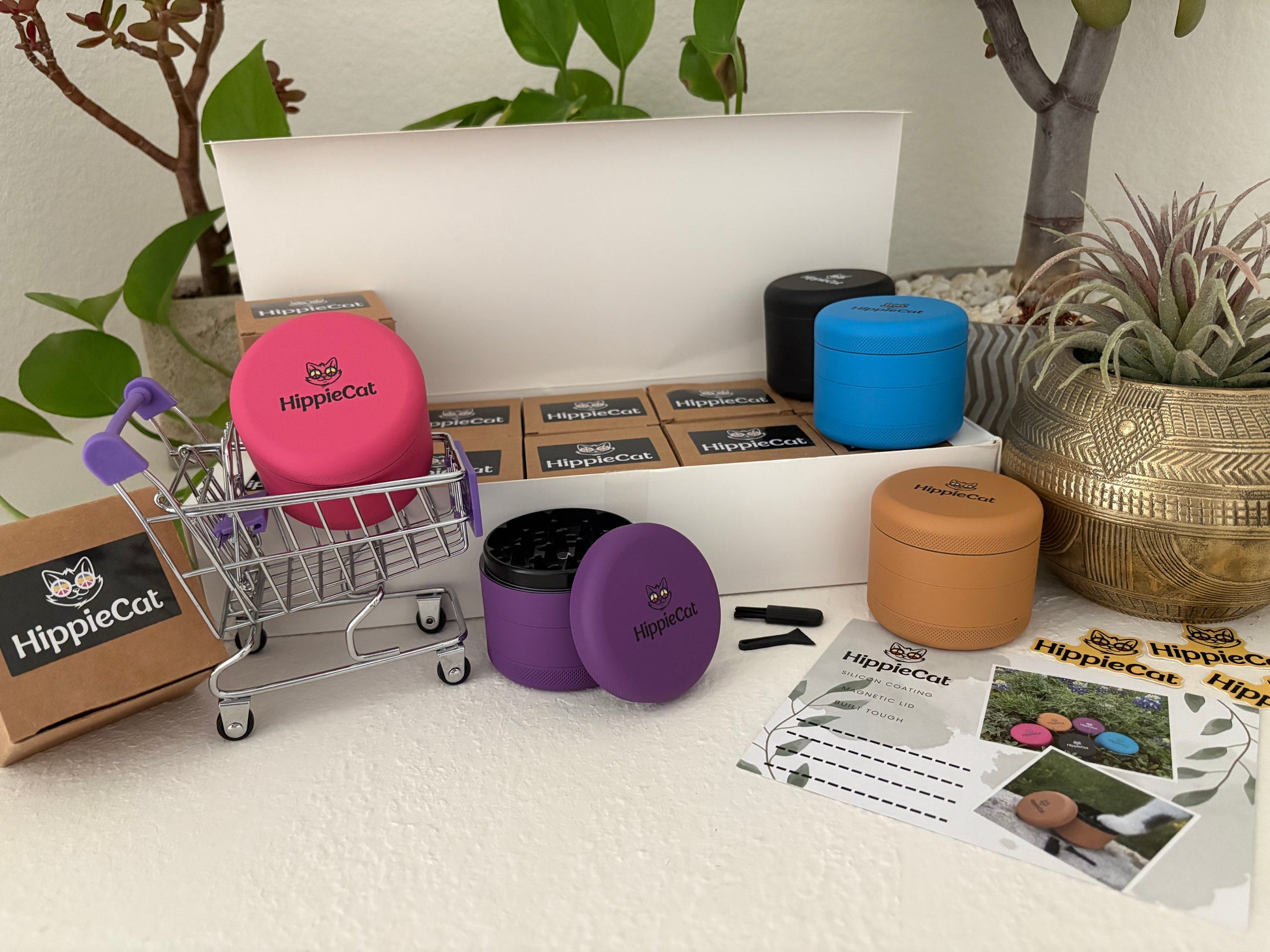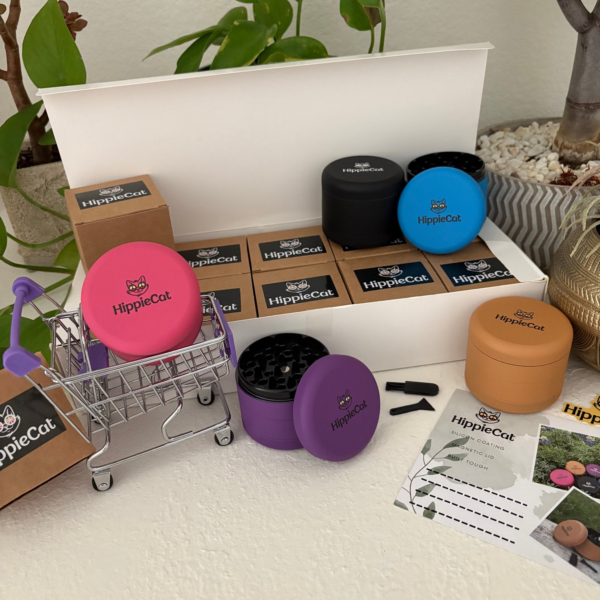 A box of 10 HippieCat grinders, 2 of each color(black, blue, pink, purple, and mustard).
